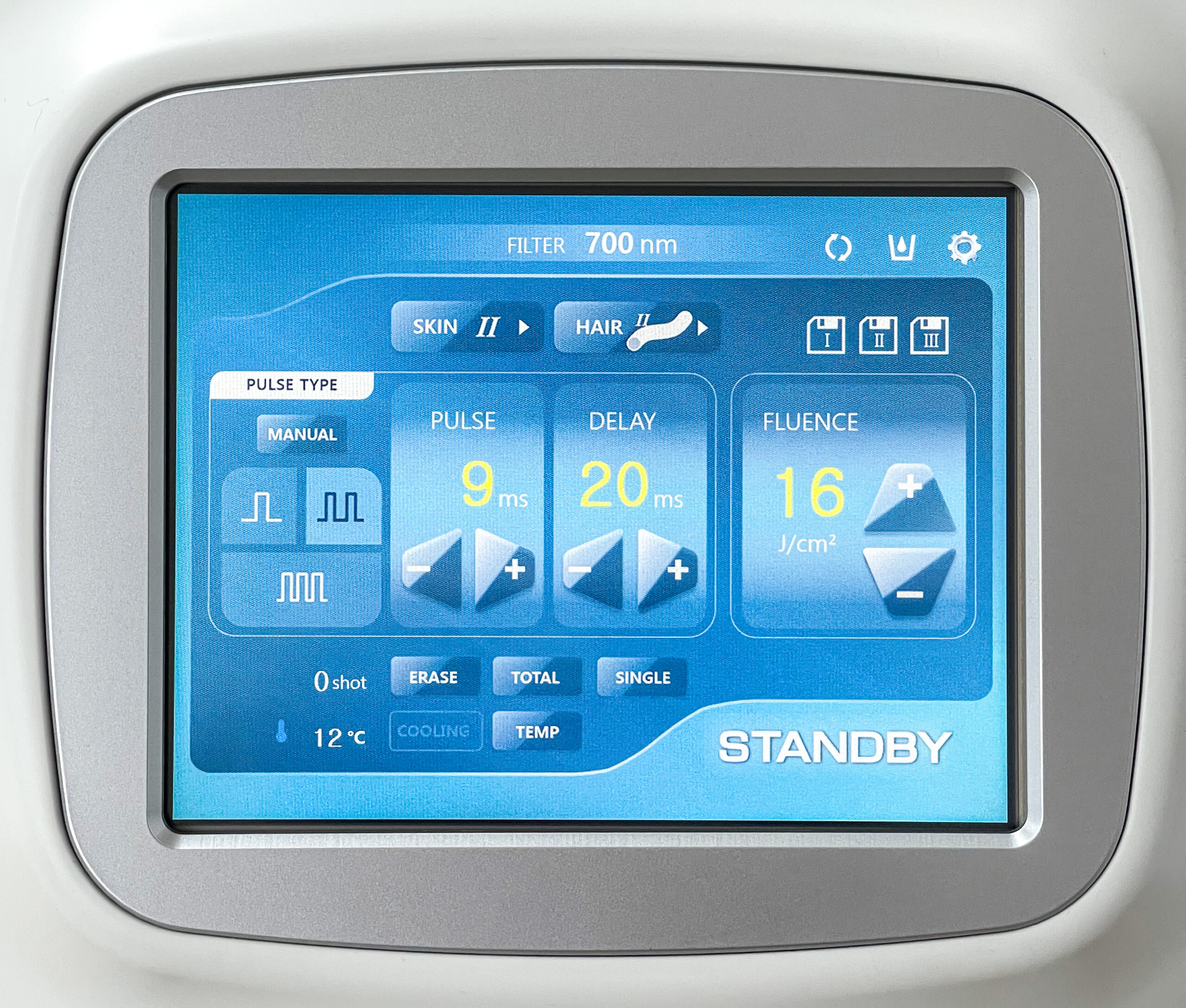 Тип фільтра показує, який фільтр встановлений у маніпулі. Кнопка типу шкіри служить для вибору типу шкіри (за умовчанням стоїть тип II). Доступні 5 режимів типу шкіри, від світлої до темної. Кнопка типу волосся – для вибору типу волосся, доступно 4 режими від світлих і тонких – до темних і товстих.